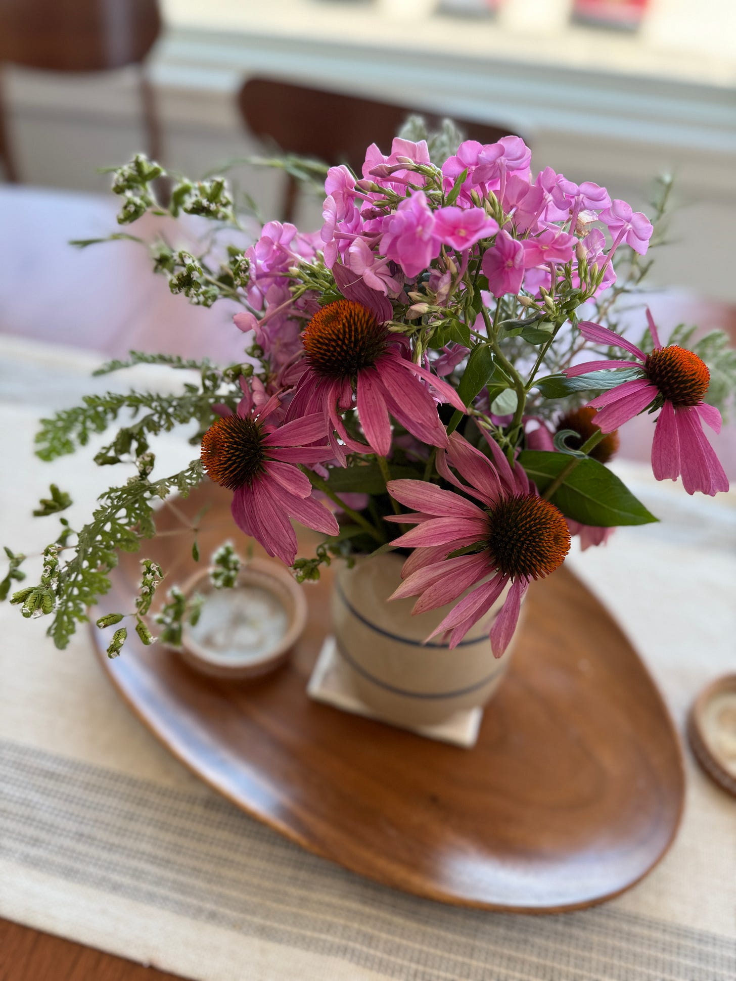 Every morning, I write my pages from the same spot at my kitchen table with a view of the beach and a little ritual that feels even more alluring than pushing snooze. Using my grandma’s old water pitcher as a vase, I arrange flowers cut from whatever's growing so fast that week it needs pruning.