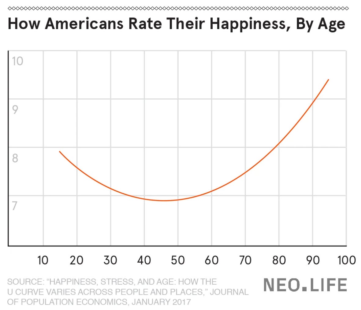 What the research says: The U-shaped happiness curve is one of the most replicated findings in psychology. Most people hit their happiness low point around age 45, then watch it rise again. This holds across gender, socioeconomic status, family structure, and human cultures worldwide. It even shows up in chimpanzees and bonobos when zookeepers rate their wellbeing. Researchers don’t fully understand why, but what Sadie and I both observe in midlife women is a shift from productivity as the primary value to purpose, a growing ability to care less about things that don’t matter, and an increased willingness to see themselves clearly. The courage to know yourself, it turns out, ripens over time.