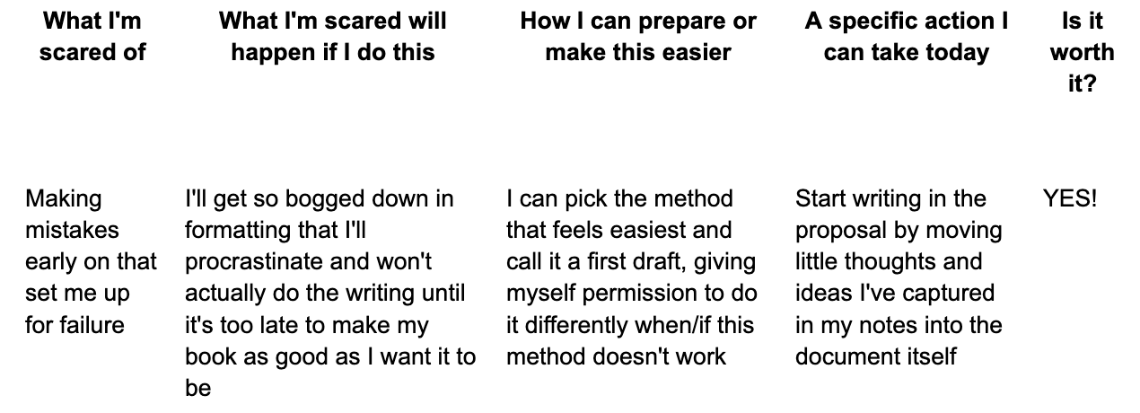 | What I’m scared of | What I’m scared will happen if I do this | How I can prepare or make this easier | A specific action I can take today | Is it worth it? |