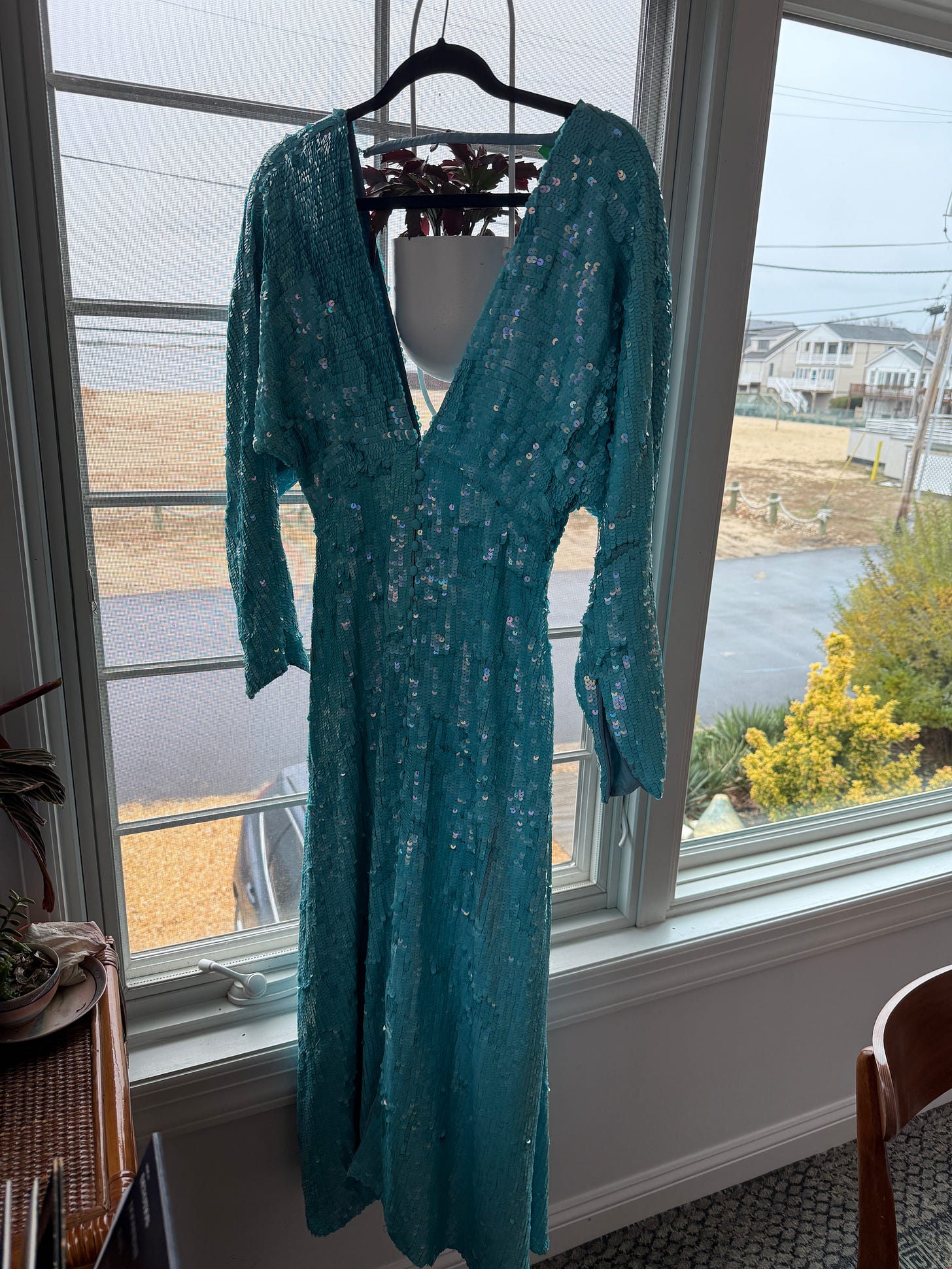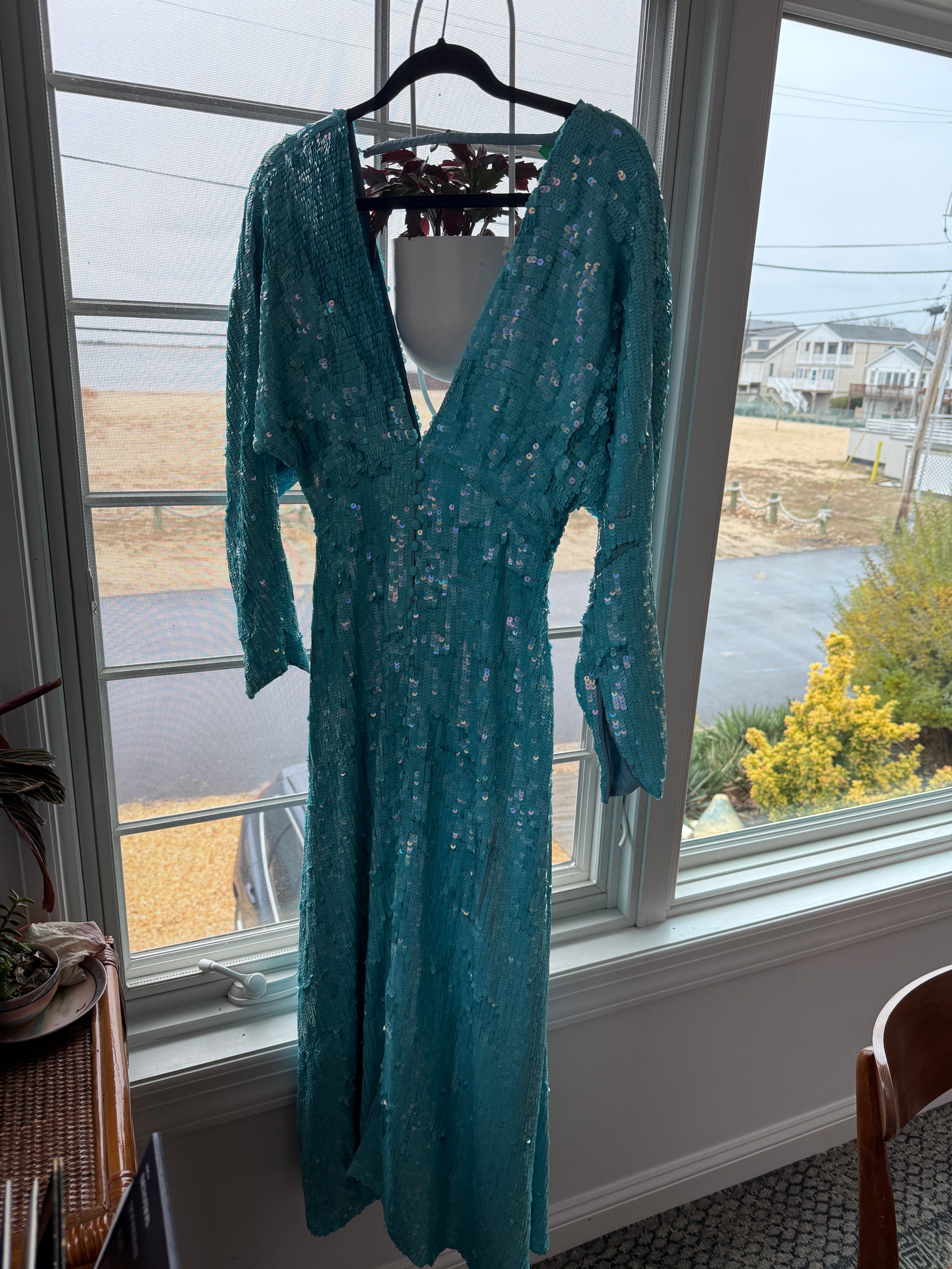 I found a vivid turquoise sequined dress at Goodwill last week.